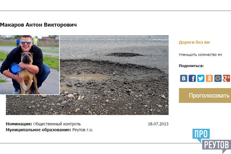 Куже представленным нами проектам реутовской молодежи можно добавить еще несколько. Один из них показался нам заслуживающим внимания, так как касается всем нам известного «узкого места» — качества автомобильных дорог. В частности, реутовчанин Антов Макаров по собственной инициативе взялся отслеживать появление ям на дорогах города и передавать эту информацию в соответствующие службы. Антон хотел бы в будущем сформировать бригаду по мониторингу состояния дорожного покрытия, причем не только в Реутове, а по всему Подмосковью.