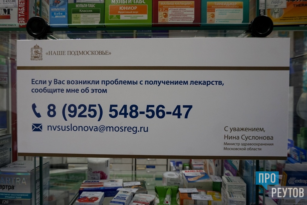 Нет препарата — звоните министру! Номер мобильного телефона и адрес электронной почты министра здравоохранения Нины Суслоновой появились на новых информационных табличках в аптеках. Первую такую табличку в нашем городе в аптеке на Садовом проезде разместили глава Реутова Сергей Юров и заместитель председателя правительства Московской области Ольга Забралова.