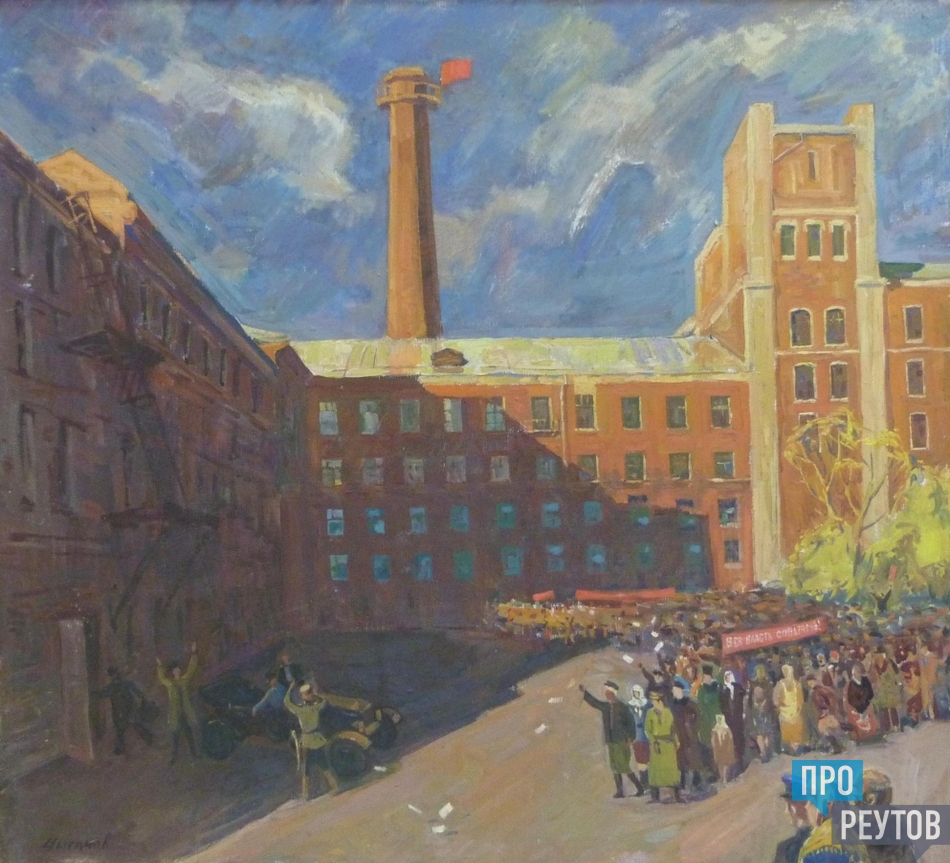Второй объект маршрута — здание Реутовской фабрики на улице Победы, 1. В прошлом оно выглядело так, как его запечатлел на полотне заслуженный художник Российской Федерации Сергей Цыганов. На картине 1917 год, тот момент, когда рабочий Сергей Лавров водружает на вершине фабричной трубы красное знамя революции. Современный облик здания не претерпел изменений, за исключением трубы.