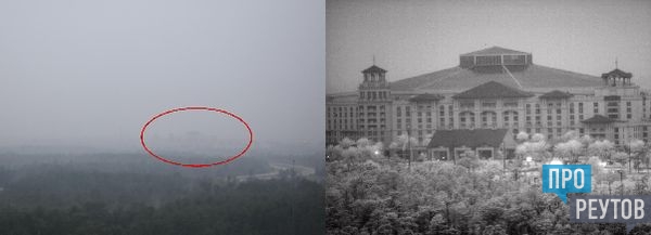 На фотографии: а) слева — что видит человеческий глаз в тумане средней плотности; б) справа — показания прибора «Мультиспектр» в тех же условиях. Фото предоставлено разработчиком.
