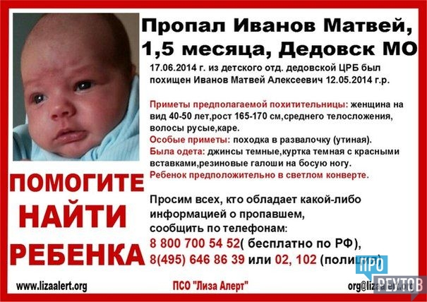 «Мы просим всех жителей Подмосковья, по возможности, подключиться к поиску ребенка, — обратился Олег Иванов. — Можно помочь добровольцам в расклеивании листовок, поместить ориентировку на своем автомобиле. А всех, кто что-либо знает о местонахождении похитительницы и малыша, просим сразу же сообщить в полицию или на горячую линию «Лизы Алерт». Помочь может каждый. И чем больше человек будет задействовано поиске, тем выше шанс найти Матвея живым и здоровым».