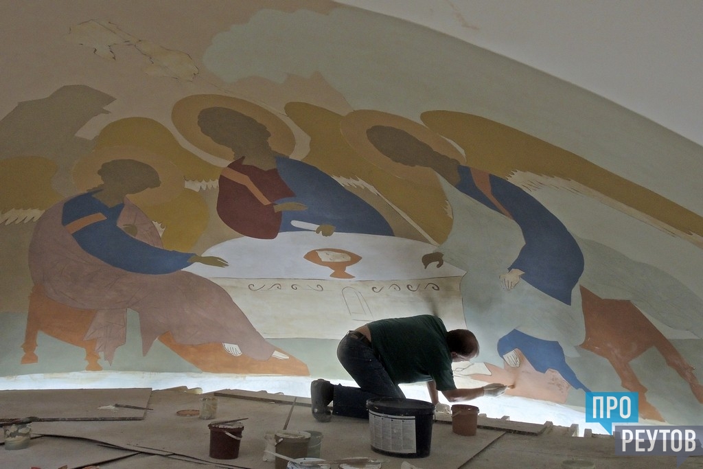 В Троицком храме Реутова продолжается роспись купола верхнего придела и другие работы по его отделке. Трудятся здесь около 10 человек строителей, но главную работу выполняют три художника-иконописца, которым помогают два подмастерья. Пыль столбом, строительные леса уходят ввысь на десятки метров, в несколько ярусов. С восьми утра и до восьми вечера, по ним вверх-вниз перемещаются строители, которым надо подготовить площадь под роспись. Художники-иконописцы работают на самом верху, под куполом.