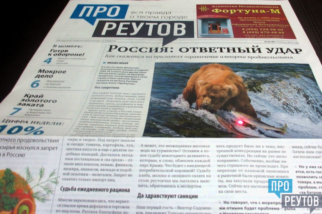 В четверг 14 августа вышел 29-й (40-й) номер бесплатной еженедельной газеты «ПроРеутов». Утром все желающие могли взять газету у вестибюлей метро «Новокосино» (на реутовской стороне) и возле железнодорожной станции Реутово. Свежий номер можно также получить в ДК «Мир», МКДЦ, НПО машиностроения, ПУ №90, городском бассейне на улице Котовского и в расчетных центрах СЦГХ.