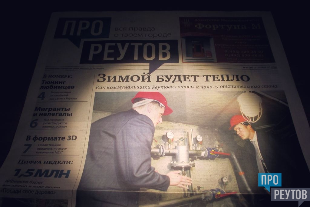 В четверг 11 сентября вышел 33-й (44-й) номер бесплатной еженедельной газеты «ПроРеутов». Утром все желающие могли взять газету у вестибюлей метро «Новокосино» (на реутовской стороне) и возле железнодорожной станции Реутово. Свежий номер можно также получить в ДК «Мир», МКДЦ, НПО машиностроения, ПУ №90, городском бассейне на улице Котовского и в расчетных центрах СЦГХ.