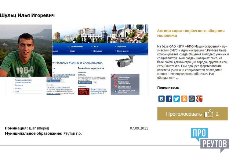 Ещё среди интересных молодёжных заявок от Реутова можно назвать проект Ильи Шульца, выпускника МГТУ им. Н. Э. Баумана, который работает сейчас инженером-конструктором в НПО машиностроения. Цель проекта — объединение творческого научного потенциала молодых специалистов. На базе ОАО «ВПК «НПО машиностроения» при участии администрации Реутова идёт процесс формирования кластера молодых ученых, инженеров, конструкторов, изобретателей. Разрабатывая инновационные и научные проекты, реутовские интеллектуалы стремятся донести свои открытия миру на различных конференциях и конкурсах. Таких, например, как Национальный научно-инновационный конкурс «Умник». Победители этого престижного состязания молодых умов получают не просто признание, но и финансы для реализации своих разработок от Фонда содействия развитию малых форм предприятий в научно-технической сфере. Реутовская молодёжь в этом вопросе уже не раз была близка к успеху. Чем не повод для гордости и дальнейших устремлений?