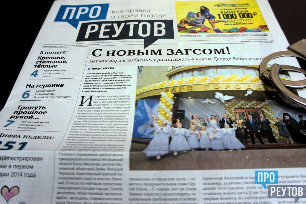 В четверг 23 октября вышел 39-й (50-й) выпуск бесплатной еженедельной газеты «ПроРеутов». Утром все желающие могли взять газету у вестибюлей метро «Новокосино» (на реутовской стороне) и возле железнодорожной станции Реутово. Свежий номер можно также получить в ДК «Мир», МКДЦ, НПО машиностроения, ПУ №90, городском бассейне на улице Котовского и в расчетных центрах СЦГХ.
