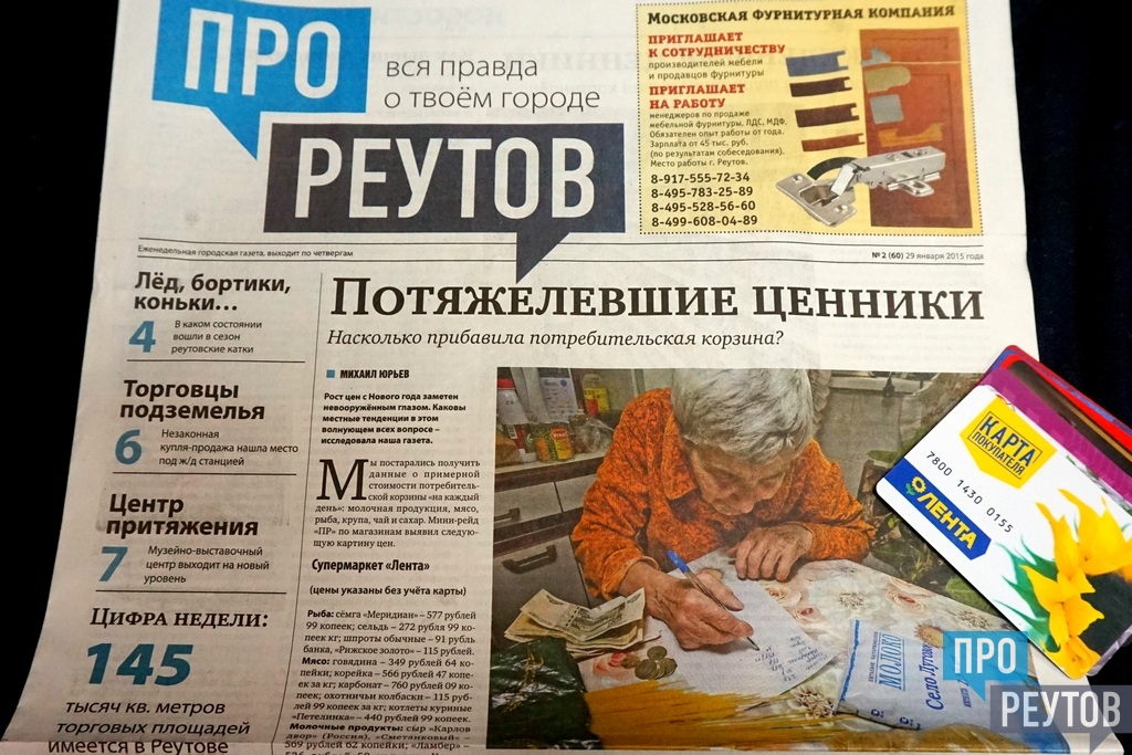 В четверг 29 января вышел 2-й (60-й) выпуск бесплатной еженедельной газеты «ПроРеутов». Утром газету можно было взять у метро «Новокосино» (на реутовской стороне) и возле железнодорожной станции Реутово. Свежий номер также выкладывается в ДК «Мир», Молодёжном культурно-досуговом центре, Музейно-выставочном центре, НПО машиностроения, колледже «Энергия» (ПУ №90), городском бассейне на улице Котовского и в расчетных центрах СЦГХ.