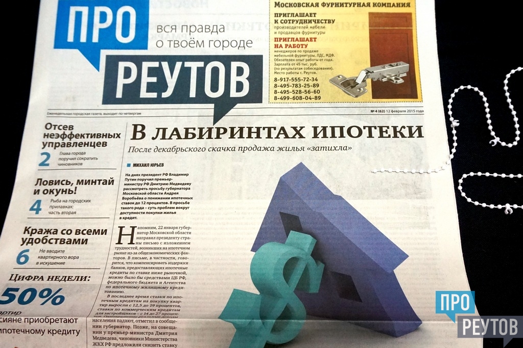 В четверг 12 февраля вышел 4-й (62-й) выпуск бесплатной еженедельной газеты «ПроРеутов». Утром газету раздавали у метро «Новокосино» (на реутовской стороне) и возле железнодорожной станции Реутово. Свежий номер также можно взять в ДК «Мир», в Молодёжном культурно-досуговом центре и в Музейно-выставочном центре на улице Победы, в НПО машиностроения, в колледже «Энергия» (ПУ №90), в комплексе «Спорт-сервис» на улице Котовского и в расчетных центрах СЦГХ.