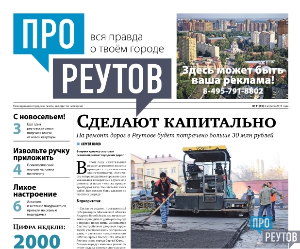 В четверг 2 апреля вышел 11-й (69-й) выпуск бесплатной еженедельной газеты «ПроРеутов». Утром газету предлагали у метро «Новокосино» (на реутовской стороне) и возле железнодорожной станции Реутово. Свежий номер также можно взять в ДК «Мир», в Молодёжном культурно-досуговом центре и в Музейно-выставочном центре на улице Победы, в НПО машиностроения, в колледже «Энергия» (ПУ №90), в комплексе «Спорт-сервис» на улице Котовского, в расчетных центрах СЦГХ и в других заведениях нашего города.