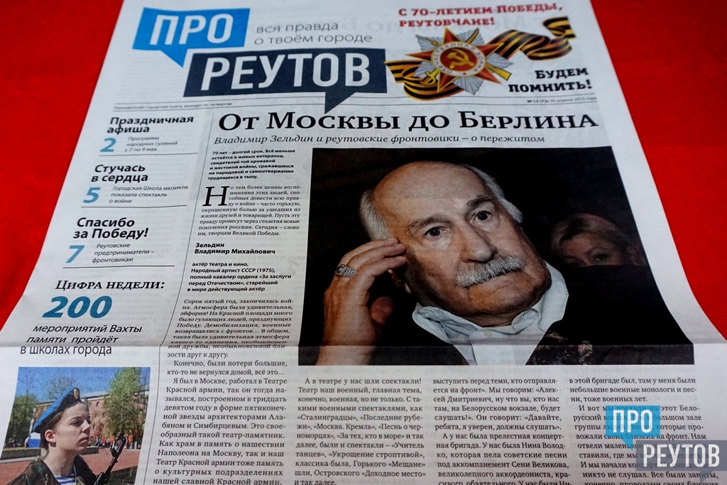 В четверг 30 апреля вышел 15-й (73-й) выпуск бесплатной еженедельной газеты «ПроРеутов». Утром газету предлагали у метро «Новокосино» (на реутовской стороне) и возле железнодорожной станции Реутово. Свежий номер также можно взять в ДК «Мир», в Молодёжном культурно-досуговом центре и в Музейно-выставочном центре на улице Победы, в НПО машиностроения, в колледже «Энергия» (ПУ №90), в комплексе «Спорт-сервис» на улице Котовского, в расчетных центрах СЦГХ и в других заведениях нашего города.