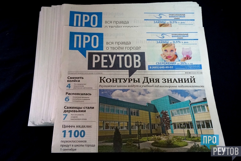 В четверг 30 июля вышел 27-й (85-й) выпуск бесплатной еженедельной газеты «ПроРеутов». Утром газету предлагали у метро «Новокосино» (на реутовской стороне) и возле железнодорожной станции Реутово. Свежий номер также можно взять в ДК «Мир», в Молодёжном культурно-досуговом центре, в Музейно-выставочном центре и в новом здании Многофункционального центра на улице Победы, в НПО машиностроения, в колледже «Энергия» (ПУ №90), в комплексе «Спорт-сервис» на улице Котовского, в расчетных центрах СЦГХ и в других заведениях нашего города.