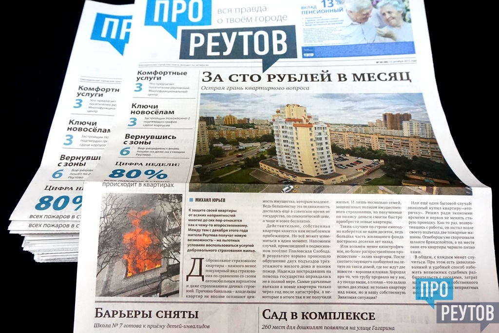 В четверг 15 октября вышел 38-й (96-й) выпуск бесплатной еженедельной газеты «ПроРеутов». Утром газету предлагали у метро «Новокосино» (на реутовской стороне) и возле железнодорожной станции Реутово. Свежий номер также можно взять в ДК «Мир», в Молодёжном культурно-досуговом центре, в Музейно-выставочном центре и в Многофункциональном центре на улице Победы, в НПО машиностроения, в подмосковном колледже «Энергия» (ПУ №90), в комплексе «Спорт-сервис» на улице Котовского, в расчетных центрах СЦГХ и в других местах.