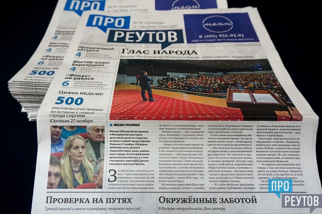 В четверг 3 декабря вышел 45-й (103-й) выпуск бесплатной еженедельной газеты «ПроРеутов». Утром газету предлагали у метро «Новокосино» (на реутовской стороне) и возле железнодорожной станции Реутово. Свежий номер также можно взять в ДК «Мир», в Молодёжном культурно-досуговом центре, в Музейно-выставочном центре и в Многофункциональном центре на улице Победы, в НПО машиностроения, в подмосковном колледже «Энергия» (ПУ №90), в комплексе «Спорт-сервис» на улице Котовского, в расчетных центрах СЦГХ и в других местах.