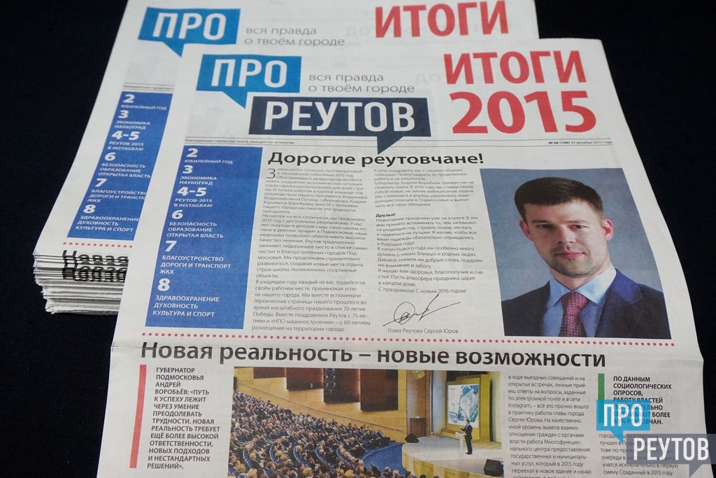 В итоговом выпуске газеты «ПроРеутов» за 2015 год мы постарались отразить самое важное, что происходило в Реутове в этом году: праздники и будни, 75-летний юбилей и 60 лет с «НПО машиностроения», экономика, образование и развитие как наукограда, здравоохранение и спорт, благоустройство и жилищно-коммунальное хозяйство, духовность и культура, безопасность и диалог власти и жителей.