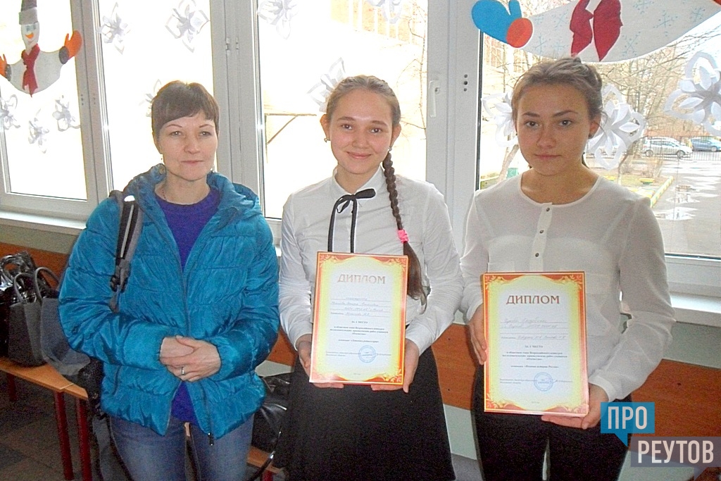 С проектом «Реутов. История в портретах» отличилась в конкурсе девятиклассница школы №6 Валерия Мокеева. Также блеснула 10-классница из той же школы Елизавета Чукова, её работа называется «Чтобы помнили (уточнение сведений в книге Памяти г. Реутова о жителях, погибших в годы Великой Отечественной войны)».