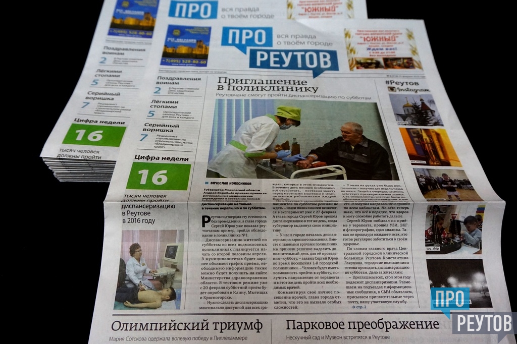 В четверг 25 февраля вышел 6-й (112-й) выпуск бесплатной еженедельной газеты «ПроРеутов». Утром газету предлагали у метро «Новокосино» и возле железнодорожной станции Реутово. Свежий номер также можно взять в ДК «Мир», в Молодёжном культурно-досуговом центре, в Музейно-выставочном центре и в Многофункциональном центре на улице Победы, в НПО машиностроения, в подмосковном колледже «Энергия» (ПУ №90), в комплексе «Спорт-сервис» на улице Котовского, в расчетных центрах СЦГХ и в других учреждениях.