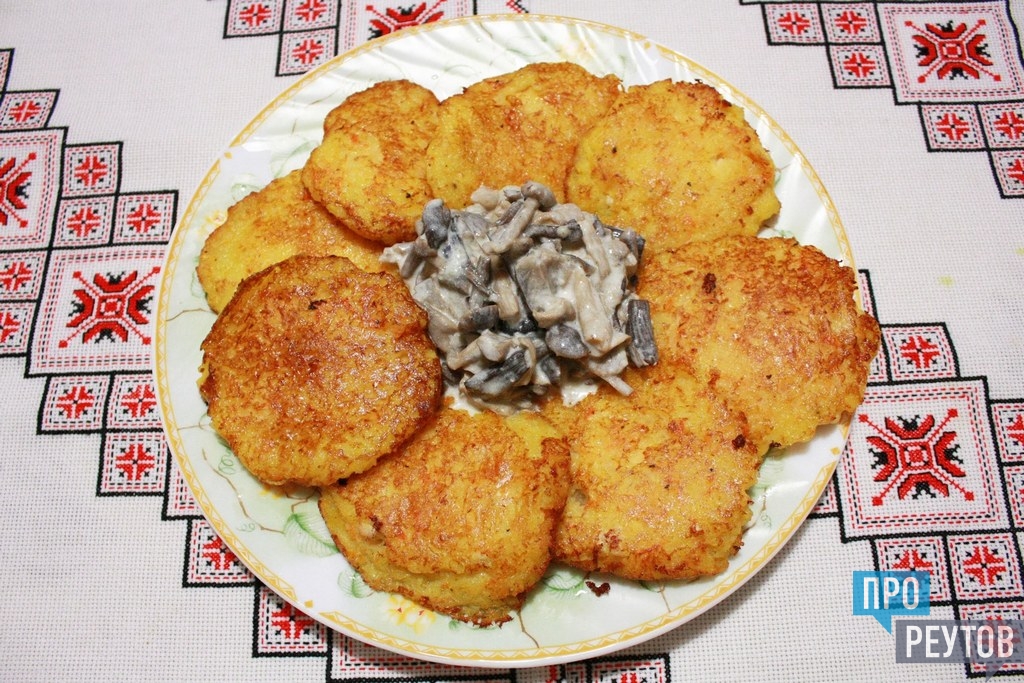 Деруны по-украински и драники по-белорусски. На самом деле они мало чем отличаются. В украинском варианте к шести сырым картофелинам и манной крупе добавляют зубчик чеснока, одну-две луковицы, чёрный перец и соль по вкусу, измельчают это всё в блендере с небольшим количеством свежего укропа, а потом жарят на сковороде, как обычные оладьи.