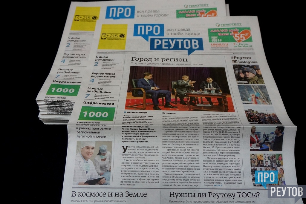 В четверг 7 апреля вышел 12-й (118-й) выпуск бесплатной еженедельной газеты «ПроРеутов». Утром газету предлагали у метро «Новокосино» и возле железнодорожной станции Реутово. Свежий номер также можно взять в ДК «Мир», в Молодёжном культурно-досуговом центре, в Музейно-выставочном центре и в Многофункциональном центре на улице Победы, в НПО машиностроения, в подмосковном колледже «Энергия» (ПУ №90), в комплексе «Спорт-сервис» на улице Котовского, в расчетных центрах СЦГХ и в других учреждениях.