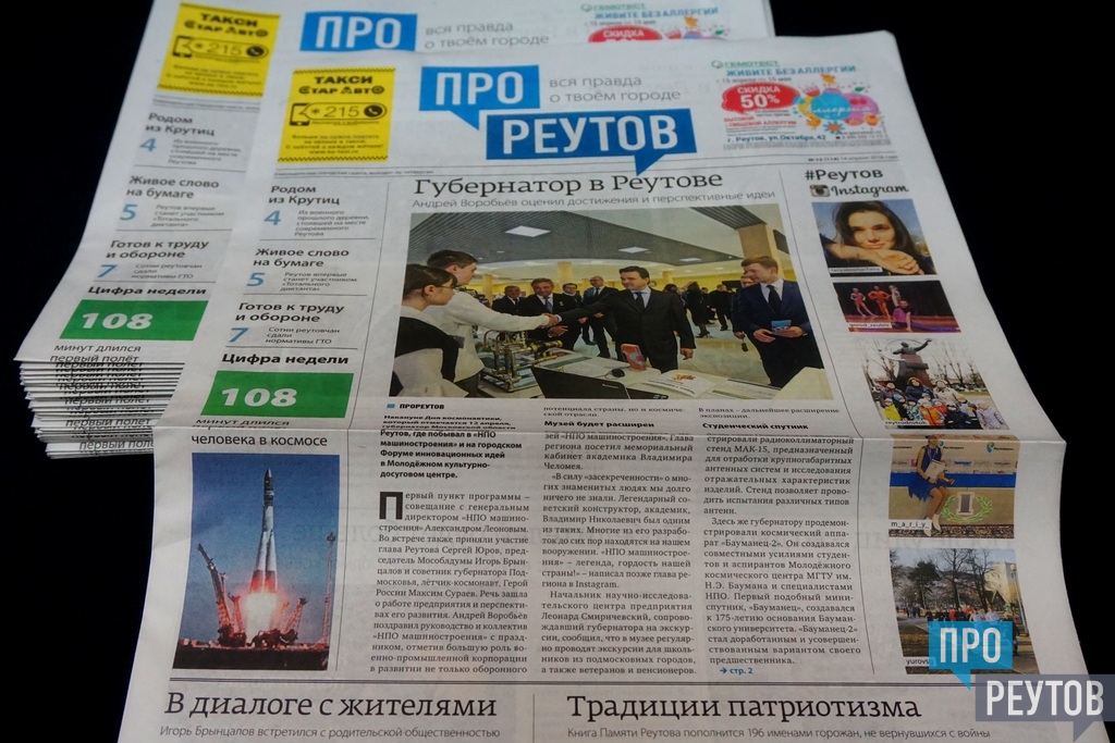 В четверг 14 апреля вышел 13-й (119-й) выпуск бесплатной еженедельной газеты «ПроРеутов». Утром газету предлагали у метро «Новокосино» и возле железнодорожной станции Реутово. Свежий номер также можно взять в ДК «Мир», в Молодёжном культурно-досуговом центре, в Музейно-выставочном центре и в Многофункциональном центре на улице Победы, в НПО машиностроения, в подмосковном колледже «Энергия» (ПУ №90), в комплексе «Спорт-сервис» на улице Котовского, в расчетных центрах СЦГХ и в других учреждениях.
