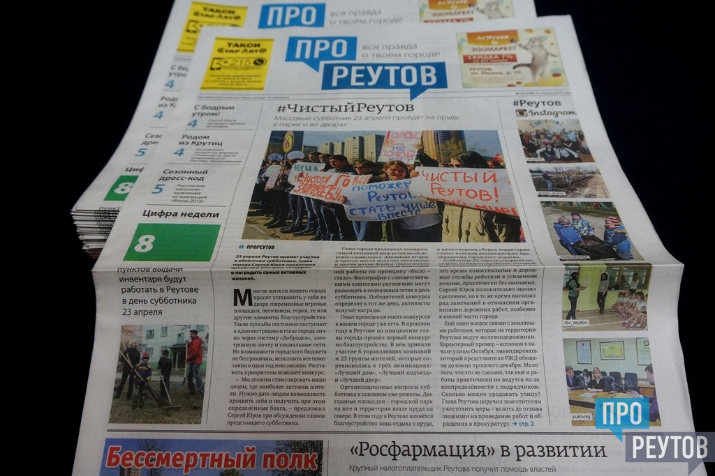 В четверг 21 апреля вышел 14-й (120-й) выпуск бесплатной еженедельной газеты «ПроРеутов». Утром газету предлагали у метро «Новокосино» и возле железнодорожной станции Реутово. Свежий номер также можно взять в ДК «Мир», в Молодёжном культурно-досуговом центре, в Музейно-выставочном центре и в Многофункциональном центре на улице Победы, в НПО машиностроения, в подмосковном колледже «Энергия» (ПУ №90), в комплексе «Спорт-сервис» на улице Котовского, в расчетных центрах СЦГХ и в других учреждениях.
