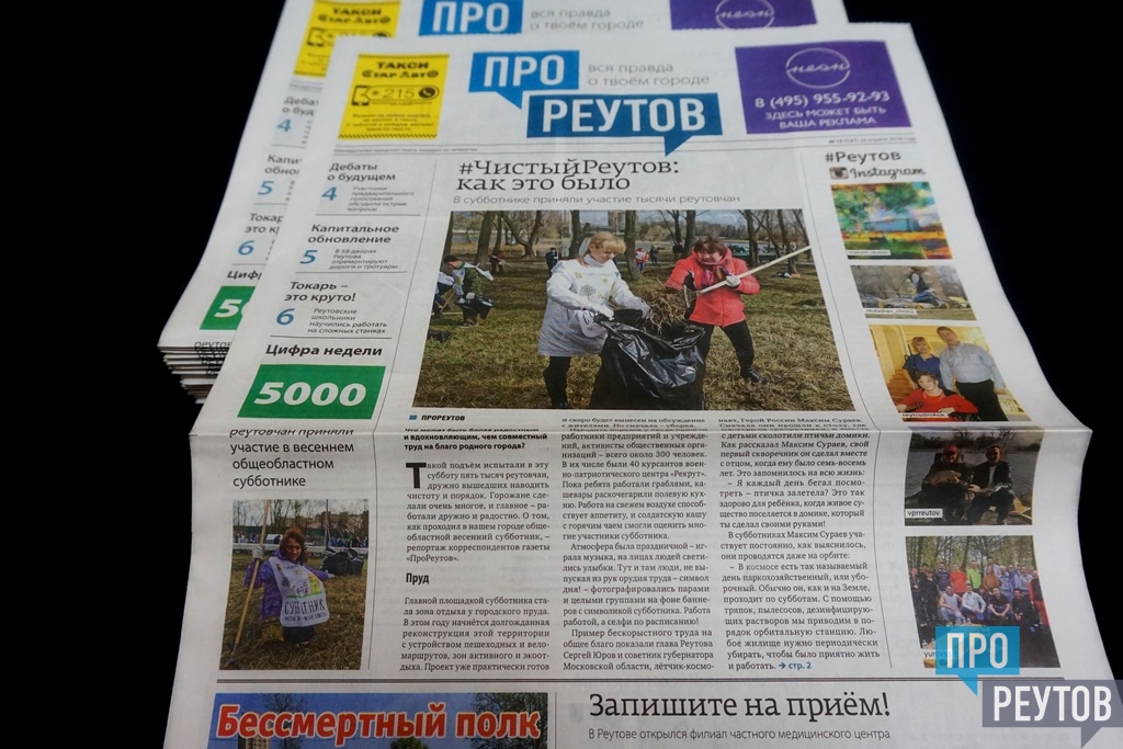 В четверг 28 апреля вышел 15-й (121-й) выпуск бесплатной еженедельной газеты «ПроРеутов». Утром газету предлагали у метро «Новокосино» и возле железнодорожной станции Реутово. Свежий номер также можно взять в ДК «Мир», в Молодёжном культурно-досуговом центре, в Музейно-выставочном центре и в Многофункциональном центре на улице Победы, в НПО машиностроения, в подмосковном колледже «Энергия» (ПУ №90), в комплексе «Спорт-сервис» на улице Котовского, в расчетных центрах СЦГХ и в других учреждениях.