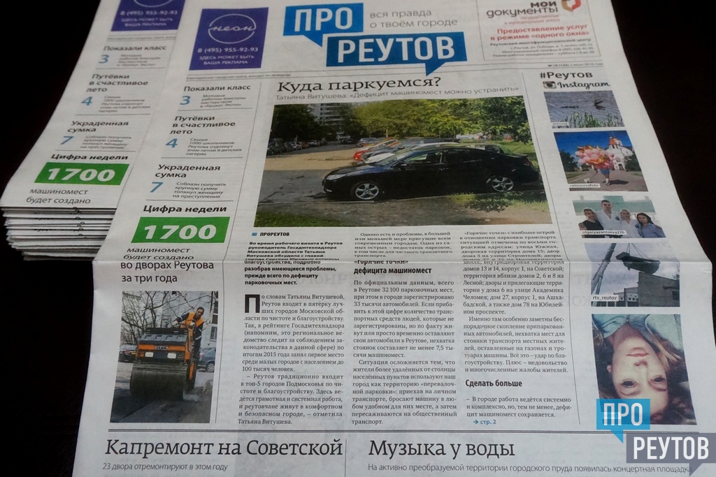 В четверг 2 июня вышел 19-й (125-й) выпуск бесплатной еженедельной газеты «ПроРеутов». Утром газету предлагали у метро «Новокосино» и возле железнодорожной станции Реутово. Свежий номер также можно взять в ДК «Мир», в Молодёжном культурно-досуговом центре, в Музейно-выставочном центре и в Многофункциональном центре на улице Победы, в НПО машиностроения, в подмосковном колледже «Энергия» (ПУ №90), в комплексе «Спорт-сервис» на улице Котовского, в расчетных центрах СЦГХ и в других учреждениях.