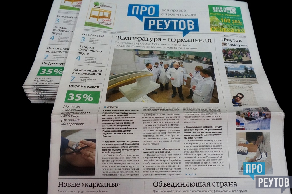 В четверг 16 июня вышел 21-й (127-й) выпуск бесплатной еженедельной газеты «ПроРеутов». Утром газету предлагали у метро «Новокосино» и возле железнодорожной станции Реутово. Свежий номер также можно взять в ДК «Мир», в Молодёжном культурно-досуговом центре, в Музейно-выставочном центре и в Многофункциональном центре на улице Победы, в НПО машиностроения, в подмосковном колледже «Энергия» (ПУ №90), в комплексе «Спорт-сервис» на улице Котовского, в расчетных центрах СЦГХ и в других учреждениях.