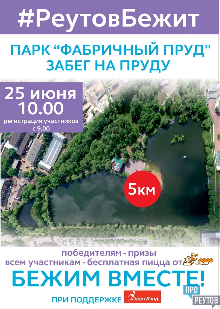 Массовый забег под девизом «Реутов бежит» состоится на Фабричном пруду в Реутове в День молодёжи 25 июня. Три победителя получат ценные призы, всех участников на финише ждёт бесплатная пицца.