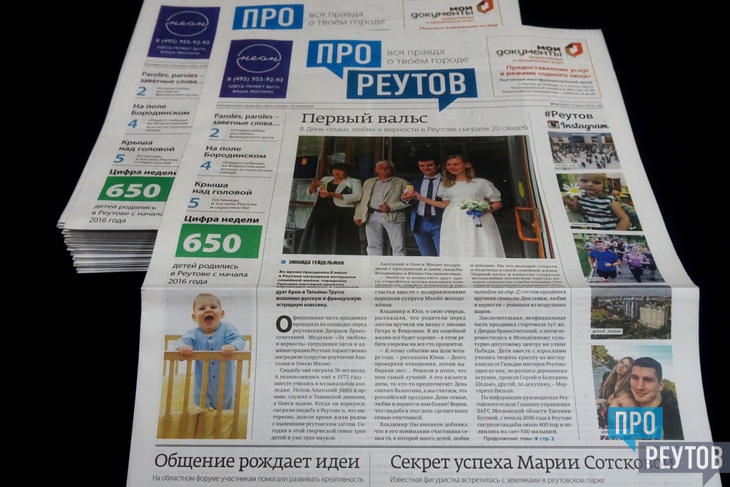 В четверг 14 июля вышел 25-й (131-й) выпуск бесплатной еженедельной газеты «ПроРеутов». Утром газету предлагали у метро «Новокосино» и возле железнодорожной станции Реутово. Свежий номер также можно взять в ДК «Мир», в Молодёжном культурно-досуговом центре, в Музейно-выставочном центре и в Многофункциональном центре на улице Победы, в НПО машиностроения, в подмосковном колледже «Энергия» (ПУ №90), в комплексе «Спорт-сервис» на улице Котовского, в расчетных центрах СЦГХ и в других учреждениях.
