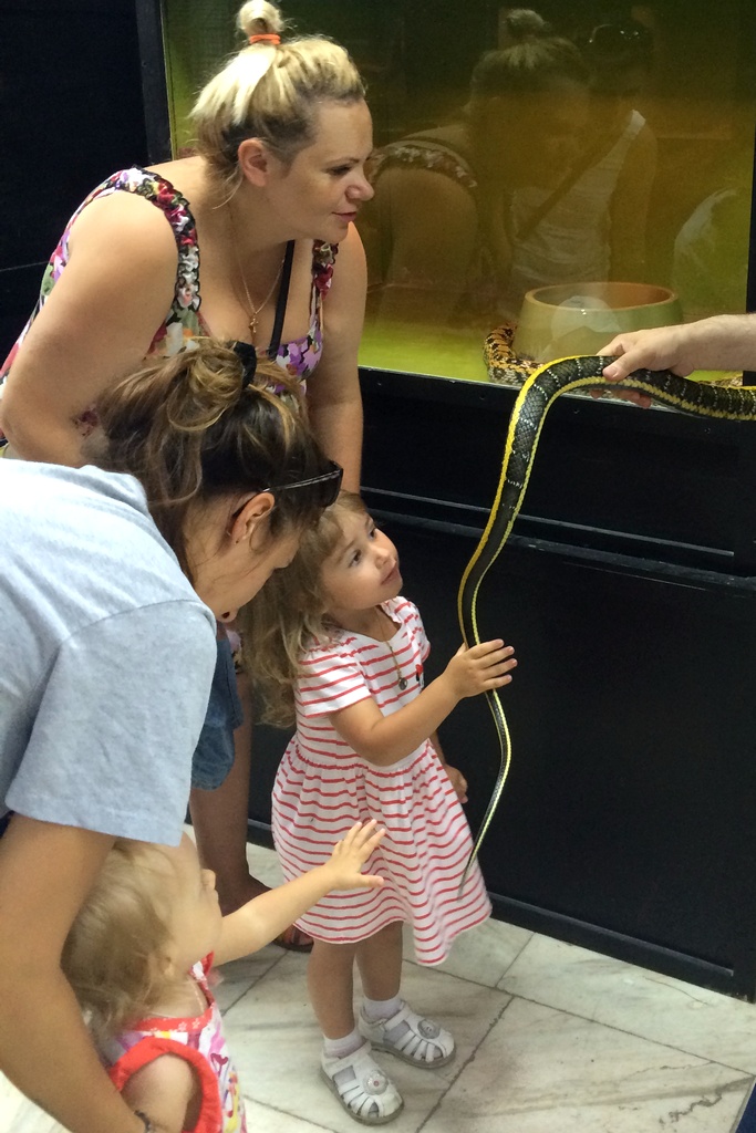 Более крупная и опасная змея — сетчатый питон. Экскурсовод объясняет, что у змеи твёрдый принцип: если поймала жертву, то должна её съесть, не отпустит. Нередко сетчатый питон нападает на людей.