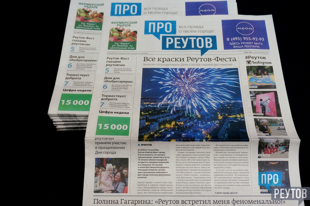 В четверг 15 сентября вышел 34-й (140-й) выпуск бесплатной еженедельной газеты «ПроРеутов». Утром газету предлагали у метро «Новокосино» и возле железнодорожной станции Реутово. Свежий номер также можно взять в ДК «Мир», в Молодёжном культурно-досуговом центре, в Музейно-выставочном центре и в Многофункциональном центре на улице Победы, в НПО машиностроения, в подмосковном колледже «Энергия» (ПУ №90), в комплексе «Спорт-сервис» на улице Котовского, в расчетных центрах СЦГХ и в других учреждениях.