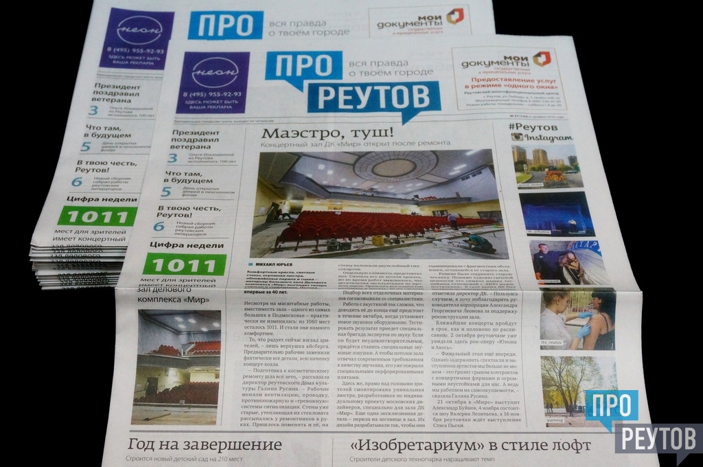 В четверг 6 октября вышел 37-й (143-й) выпуск бесплатной еженедельной газеты «ПроРеутов». Утром газету предлагали у метро «Новокосино» и возле железнодорожной станции Реутово. Свежий номер также можно взять в ДК «Мир», в Молодёжном культурно-досуговом центре, в Музейно-выставочном центре и в Многофункциональном центре на улице Победы, в НПО машиностроения, в подмосковном колледже «Энергия» (ПУ №90), в комплексе «Спорт-сервис» на улице Котовского, в расчетных центрах СЦГХ и в других учреждениях.