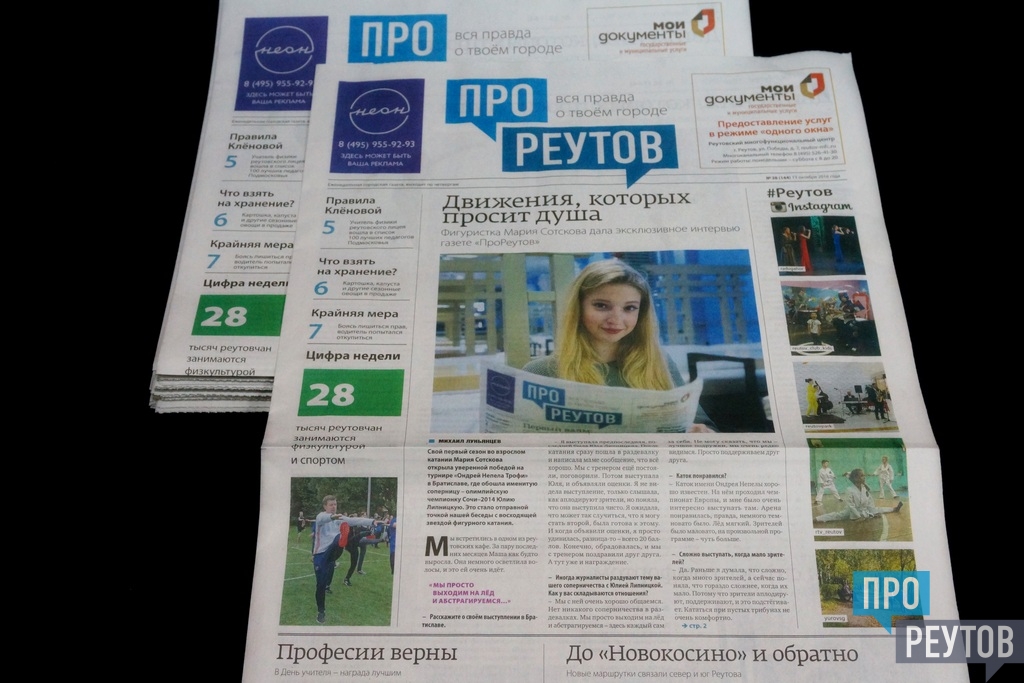 В четверг 13 октября вышел 38-й (144-й) выпуск бесплатной еженедельной газеты «ПроРеутов». Утром газету предлагали у метро «Новокосино» и возле железнодорожной станции Реутово. Свежий номер также можно взять в ДК «Мир», в Молодёжном культурно-досуговом центре, в Музейно-выставочном центре и в Многофункциональном центре на улице Победы, в НПО машиностроения, в подмосковном колледже «Энергия» (ПУ №90), в комплексе «Спорт-сервис» на улице Котовского, в расчетных центрах СЦГХ и в других учреждениях.