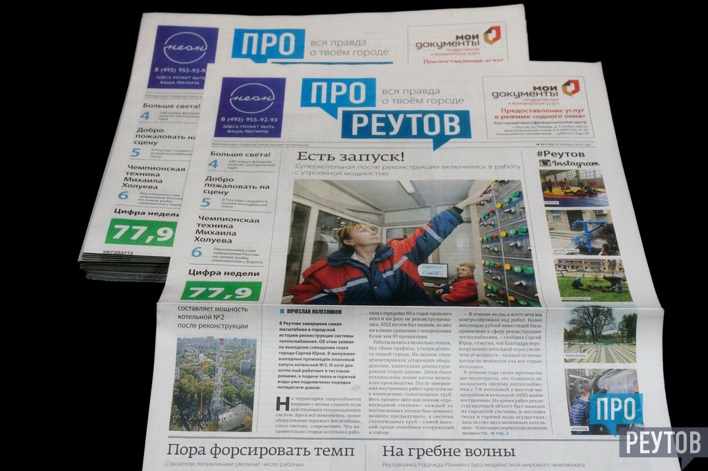 В четверг 20 октября вышел 39-й (145-й) выпуск бесплатной еженедельной газеты «ПроРеутов». Утром газету предлагали у метро «Новокосино» и возле железнодорожной станции Реутово. Свежий номер также можно взять в ДК «Мир», в Молодёжном культурно-досуговом центре, в Музейно-выставочном центре и в Многофункциональном центре на улице Победы, в НПО машиностроения, в подмосковном колледже «Энергия» (ПУ №90), в комплексе «Спорт-сервис» на улице Котовского, в расчетных центрах СЦГХ и в других учреждениях.
