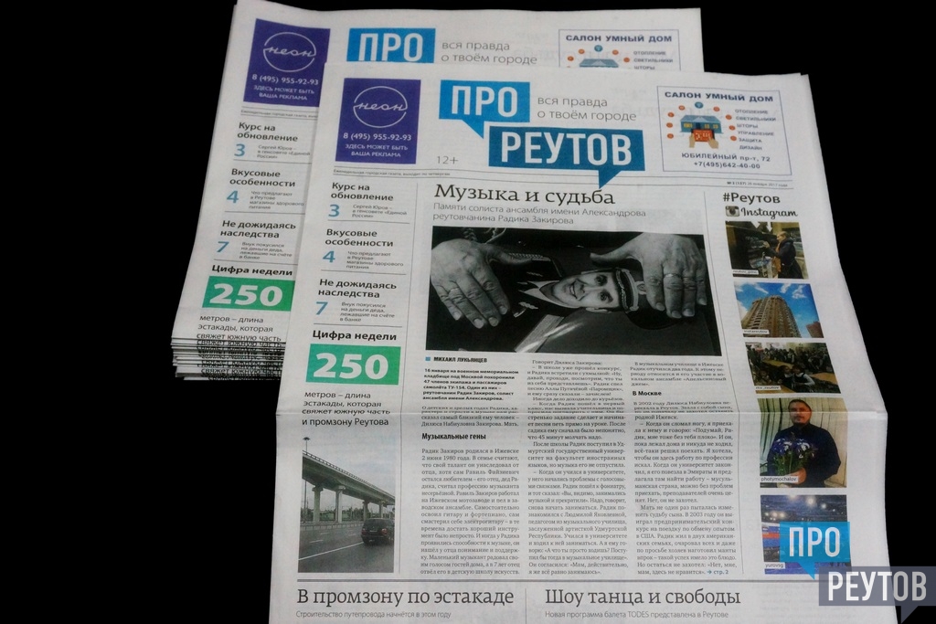 Газету «ПроРеутов» бесплатно раздают у метро «Новокосино» и возле железнодорожной станции Реутово по четвергам с 7.00 до 8.00.