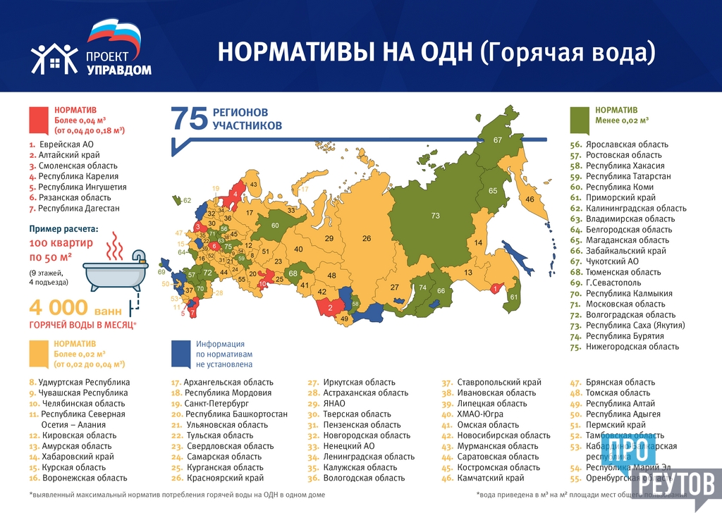 «Мы выявили, что по стандартам ОДН холодной воды у 9 из 76 регионов нормативы высокие, у 48 средние, у 19 – минимальные. По горячей воде нормативы по ОДН высокие в 7 регионах, где на одну мойку общедомового имущества тратится 180 литров воды на 1 квадратный метр общедомовой площади, у 48 регионов нормативы средние, у 27 минимальные. По нормативам ОДН в части электроэнергии - в «красной зоне» находятся 24 региона, в зеленой – 30, в желтой – 25 регионов. И в субъектах, где нормативы максимальные, региональным координаторам необходимо понять, почему были установлены такие показатели», - сказал Качкаев.
