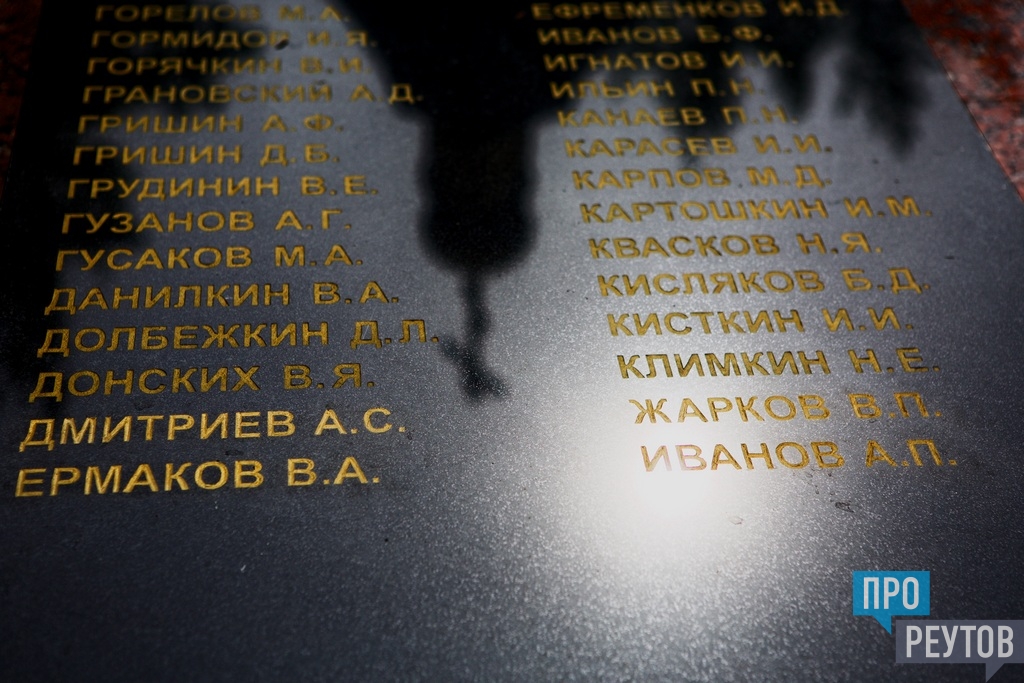 Имена на плиты нанёс известный реутовский скульптор Виталий Казанский. По его проекту в июне прошлого года прошла реконструкция Мемориала Славы. Было установлено пять новых гранитных плит, на которые нанесли 190 имён реуточан, погибших и пропавших без вести на фронтах Великой Отечественной войны. Теперь же на плитах значится 942 имени.