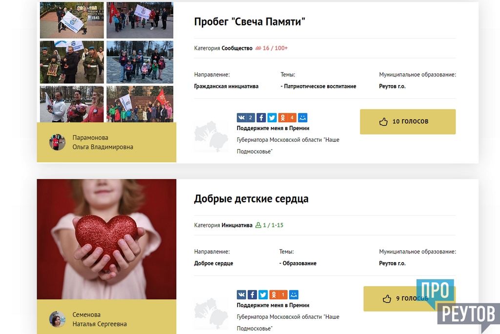 Прямо на сайте можно поддержать понравившуюся разработку. На момент написания статьи по числу голосов среди реутовских проектов лидировал «Пробег “Свеча Памяти”». Автор — Ольга Парамонова, мама пятерых детей и вице-президент Ассоциации многодетных семей «Много Нас».