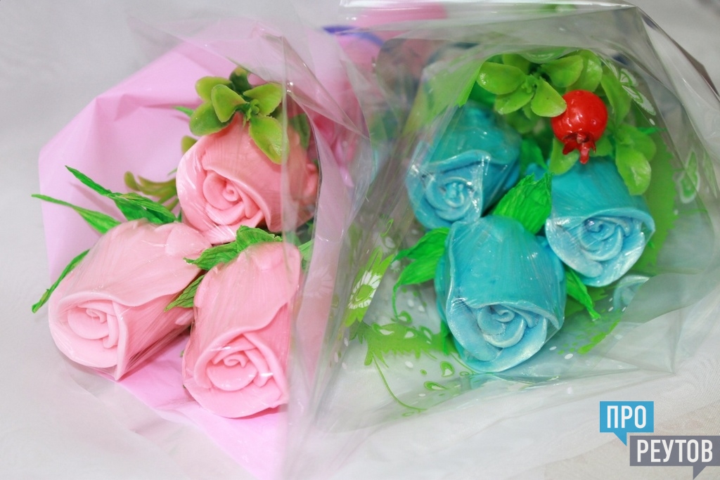 Вот где истинный Клондайк подарков. Во-первых, ароматные букеты из мыла в плетеных корзинах. Цена — от 450 до 1000 рублей. Букет можно заказать и подобрать индивидуально.