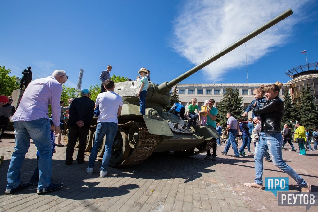 Пока люди постарше с удовольствием фотографировались на фоне техники, юное поколение пользовалось возможностью все облазить, везде заглянуть и все потрогать. Представителю экспозиции в форме красноармеца-танкиста приходилось быть бдительным, все-таки возраст экспонатов уже достаточно солидный.