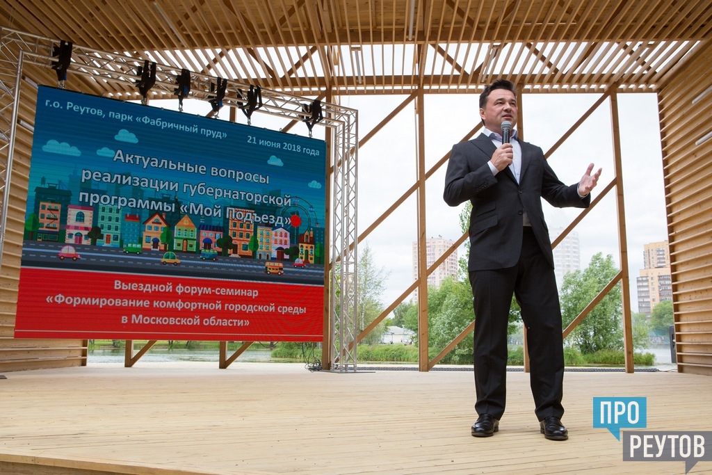 Губернатор Подмосковья Андрей Воробьёв посетил выездной форум-семинар управдомов в Реутове. На мероприятии, проходившем на территории парка «Фабричный пруд», представители различных муниципальных образований региона обсуждали формирование комфортной городской среды в Московской области. Была проведена торжественная церемония награждения победителей конкурса «Лучший подъезд Подмосковья – 2017» – подъезд дома № 3 на улице Войтовича в Реутове завоевал третье место.