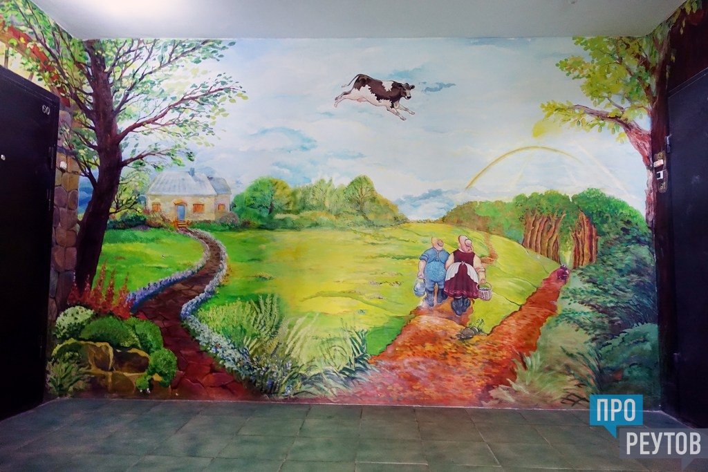 Ещё раз заметим, что многие жители продолжают работать над завершением своих проектов. Хотя есть и уже готовые. Например, в подъезде дома 23 на улице Ашхабадской. Реутовчанин Виктор Новиков вместе с женой больше года назад начал превращать стены подъезда на своём этаже в произведение искусства. В прошлом году в рамках конкурса «Мой комфортный дом» Новиковы вошли в число победителей, получив в награду за свою работу 15 тысяч рублей премии. В этом году, как выясняется, их подъезд вновь может стать лучшим, потому что пример творческих соседей вдохновил и других жителей дома. К Виктору Викторовичу присоединилась соседка с нижнего этажа, художница Галина Колонина, вместе они нарисовали на стенах своего подъезда новые сюжеты. Некоторые образы позаимствовали из известных картин, а что-то – из собственной фантазии: например, парящую над лесом корову... Увиденным вдохновились жительницы соседнего подъезда и решили на своём этаже выложить мозаику. Эти инициативы поддержала управляющая компания: помогла в закупке необходимых материалов.