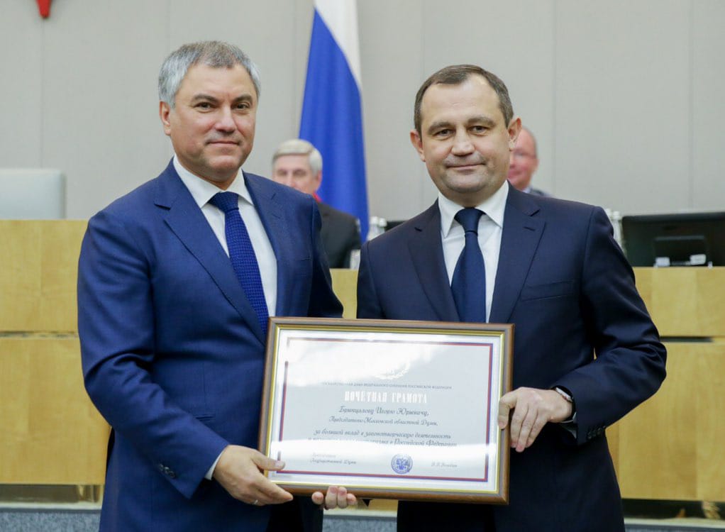 Председателю Мособлдумы Игорю Брынцалову была вручена Почётная грамота Государственной Думы за большой вклад в законотворческую деятельность и развитие парламентаризма в Российской Федерации.