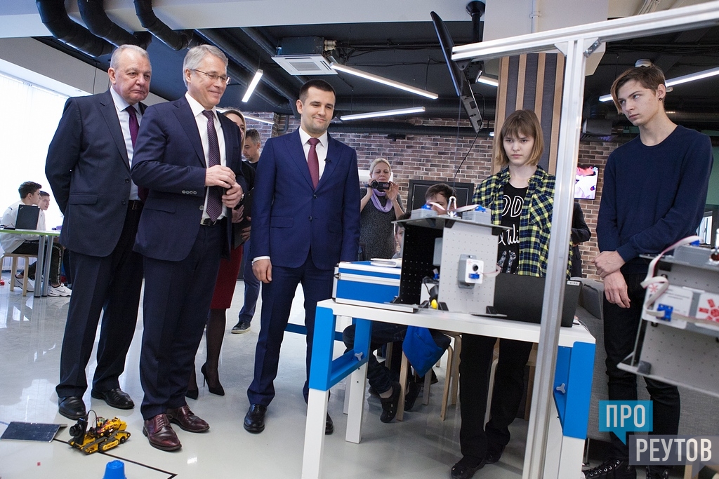 Вместе с руководителем «Изобретариума» Натальей Кивва и генеральным директором, генеральным конструктором «НПО машиностроения» Александром Леоновым (проект реализуется совместно с градообразующим предприятием Реутова. — Прим. редакции) почётные гости осмотрели лаборатории технопарка, пообщались с ребятами и с их педагогами.