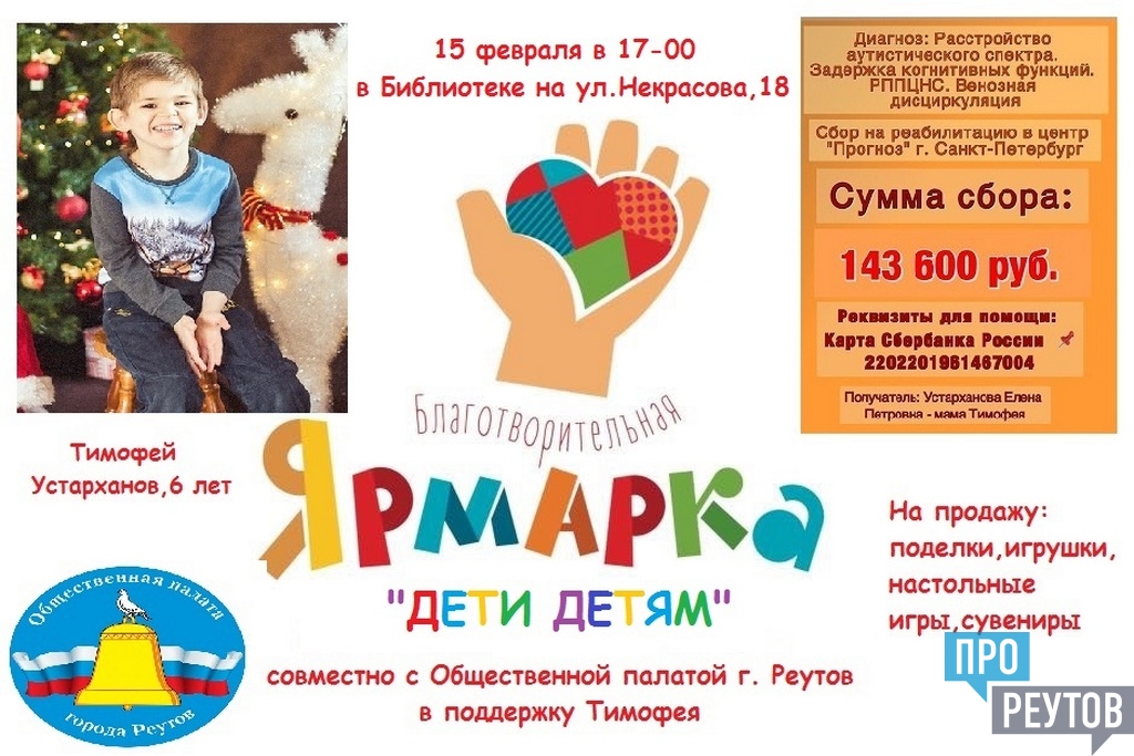 Она отметила, что деньги от продаж пойдут на помощь тяжелобольному мальчику из Реутова Тимофею Устарханову. Тимофей страдает расстройствами аутистического спектра, задержкой психо-речевого развития и когнитивных функций. Такая акция проходит в стенах библиотеки впервые.