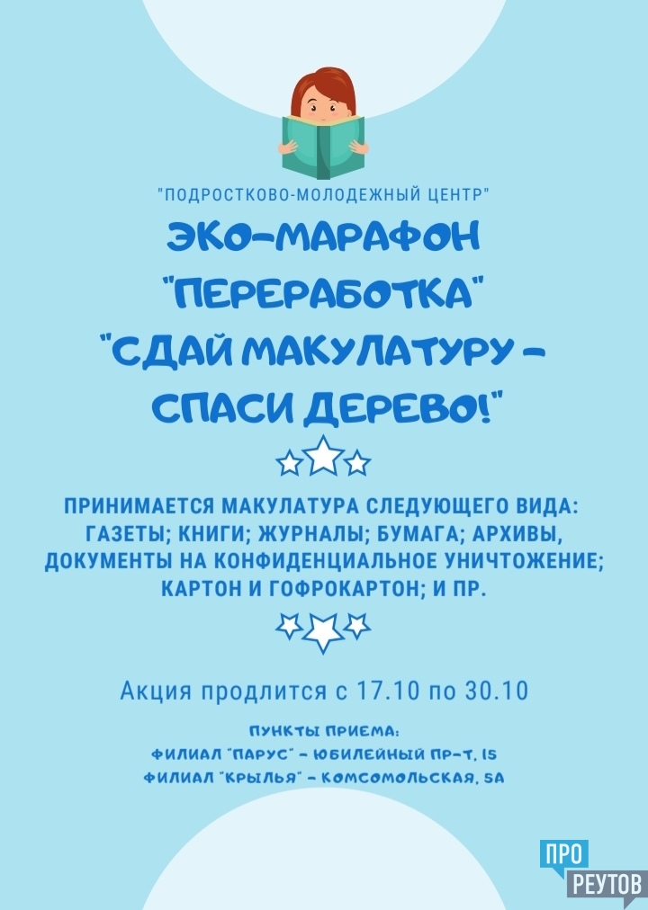 Подростково-молодежный центр Реутова инициировал экологический марафон. С 17 по 30 октября в филиалах ПМЦ «Парус» (Юбилейный пр-т, 15) и «Крылья» ( ул. Комсомольская, 5А) будут работать пункты приёма «Сдай макулатуру — спаси дерево». Принимаются газеты, книги, бумага, документы на уничтожение, картон и гофрокартон.