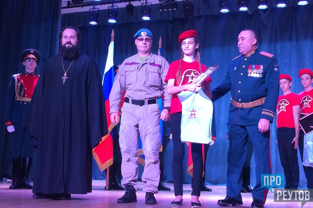 Под марш знамённая группа внесла государственный флаг и флаг Реутова, а также знамя Всероссийского военно-патриотического движения. Под барабанный бой на сцену поднимались виновники торжества: ученицы 2 «В» класса Валерия Корсачёва и Ангелина Маглакелидзе, учащиеся 5 «Е» Варвара Барздыко, Иван Васильев, Ксения Кожеватова, Тимур Ромашкин и Юлия Суравцева, 5 «Д» — Леонид Верижников, Мария Дёмкина, Анастасия Емельяненко, Ирина и Ольга Канатовы, Максим Синельников и Кирилл Шинкаренко, ученик 7 «А» Алексей Верижников, учащиеся 10 «А» Данил Гришин и Леонид Ширенин.