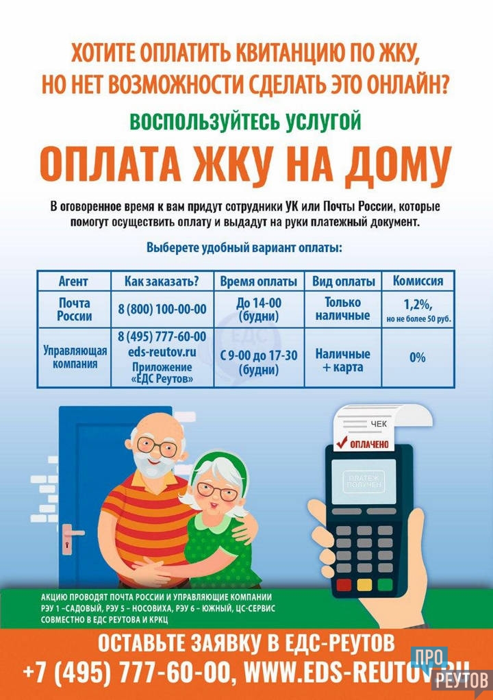 Если у вас нет возможности оплатить квитанции онлайн, оставьте заявку на оплату по телефонам: 8 (800) 1-000-000 или 8 (495) 777-60-00, на сайте eds-reutov.ru или через мобильное приложение «ЕДС Реутов». В заранее оговоренное время к вам домой придёт сотрудник почты России или управляющей компании, произведёт оплату и выдаст чек.