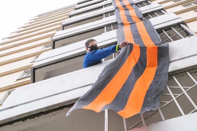 Так, бригада сотрудников управляющей компании «ЦС-Сервис» трудится с самого утра — устанавливает на фасаде дома № 2 по улице Новая два полотна шириной 70 сантиметров каждое на всю высоту семнадцатиэтажки. Работу начали с последнего этажа — полотна спускают вниз и крепят к парапетным решёткам. А рядом с георгиевской лентой на балконах разместят государственные флаги Российской Федерации.