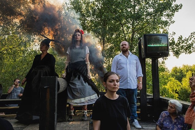 Начнётся трансляция в 19:00 на страницах Никола-Ленивец \ Nikola-Lenivets в социальных сетях Facebook и ВКонтакте. В постановке Анна исполняет роль женщины с кошками.